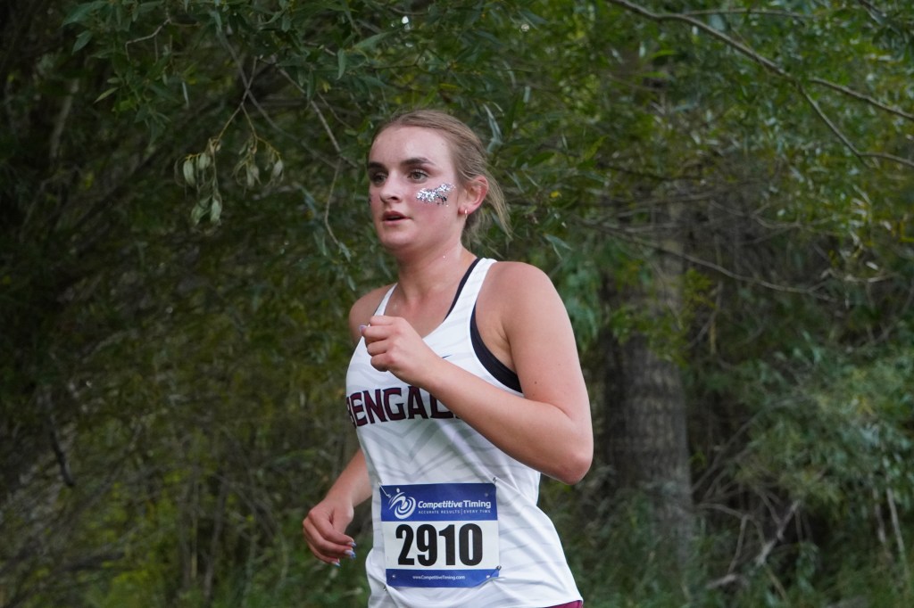 In JV competition, the girls flexed their depth and finished fourth as a team behind a fourth-place individual finish by junior Ella Irey, who improved on her season best by more than a minute to finish in 21:20. Next across the line for the Bengals was junior Margot Muszkiewicz, who ran a lifetime best of 21:54. About 40 seconds later, a pack of Bengals crossed in quick succession: senior Alivia Thunstrom (22:33, 24th), sophomore Wren Clum (22:34, 25th), sophomore Gabbi LaVoie (22:35, 26th), sophomore Adela Sund (22:37, 27th), sophomore Emily Davidson (22:39, 28th), and sophomore Cooper Judd (22:41, 33rd). For Judd, that was a lifetime best and it meant the Bengals claimed one fifth of the top 40 places. And freshman Ellie Coburn (23:06, 45th), and juniors Mia Carrell (23:11, 51st) and Caoimhe Gallgher (23:15, 52nd) trailed close behind, as well.